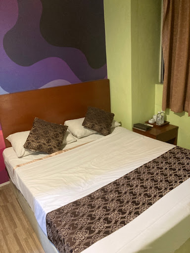 B) Room Really small and smells so weird. I don't even know how to describe it. It smells like really wet thick cloth that has been kept in a drawer and you don't know it. In bahasa we called it as 'kepam' 😂 The hygiene and cleanliness of the bedsheet is really questionable, kinda have a feeling that they don't change it.. idk. Really small space for you to perform your prayers. The walls are mouldy but they try to hide it with a fancy wallpaper but failed miserably. Old air-con that gives off this really weird smell as you turned it on, but it works well to cool the room as the room is small 😅