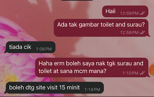 Read moreOkay I nak complain about customer service, they really need to go to classes to educate themself because literally I aksed them politely je pictures of toilet and the surau. MIND you that it is valid for us customer nak tahu toilet and surau macam mana lagi2 dkt tmpt2 mcm ni. You can see yourself the conversation of both of us. There’s no common sense at all, if you don’t have the picture, go and take it. If you’re not there, asked the workers yg ada dkt situ. If takda workers, why takda siapa jaga tempat tu? So basically boleh jela masuk tanpa bayar. We paid to go there, so, I have the right to asked questions. And then I asked kenapa dengan bahasa saya, that person doesn’t reply at all. Peliknya laju pulak bagi gambar, so maksudnya that person tu dkt je dengan toilet, surau untuk take the pictures. These kind of drama won’t appear kalau ada...