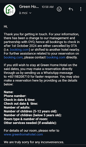 Read moreMAFIA/CORRUPTION We booked here 6 months ago. Long time in advance. We contacted them few days before coming to ask at what time is check-in time. They replied our reservation has been cancelled !!! Our reservation was still valid on Booking.com website and we didn't cancel it. After we insisted for explanation they finally told us that Oyo group is no longer business partner with Booking.com since October 1st 2024 so they both knew long time in advance but still cancelled last minute our reservation with no compensation. We experienced same issue with Oyo Collection Sejinau in Langkawi (same MAFIA group) and legal action is currently going on against them. If you have been also victim join us for the...