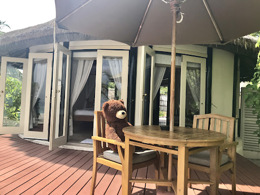 The beachfront villa where we stayed was very nicely decorated, spacious, have natural roof made out of straw and deck with pergola on the beach. The outdoor shower, jaccuzzi and small pool is great to enjoy in private. We enjoyed lying down on the deck watching stars at night. We are happy with their sustainable effort in the resort of plastic-free approach by using glass water bottles, paper straws, biodegrable shampoo and soap. No plastic chairs and plastic bags. Growing thier own vegetables using a hydroponic system and organic gardening. Varieties of plants around the island making it habitable for beautiful and friendly water hens, herons, canary birds, fruit bats, bees, dragon flies, crabs, hermit crabs and many other small creatures. They take care of the island beach naturally so there is no unsightly rock barrier on the reef.