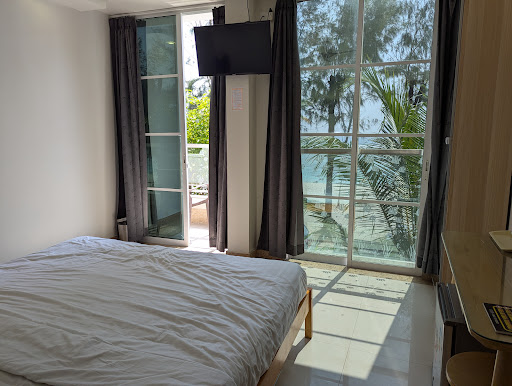 The hotel is a four-story building with four rooms on each floor. Two of the rooms on the beachside have balconies with beautiful ocean views, while the other two are standard rooms. The beachside rooms are more spacious compared to the standard ones. Amenities include air conditioning, a TV, WiFi, shampoo and shower gel, toilet tissue, and two complimentary 500ml water bottles.