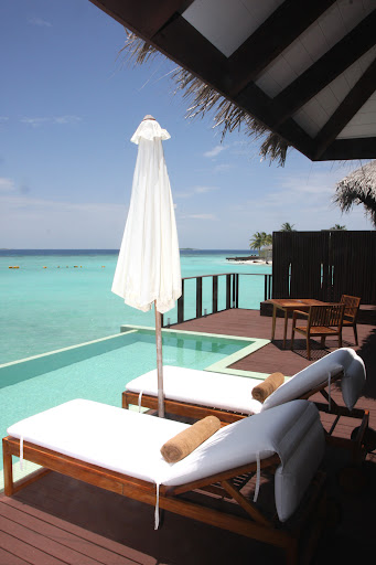 We chose a water sunset pool villa because we live in Miami Beach in a beachfront property and see the sunrise every day, so we were excited to see sunsets. We had villa 29 and I feel that this was the best villa of the island. It was at the end of the row, clean & very spacious. Right in front of our villa, facing the ocean, there was an adorable little turtle that we named Trudi, who seems to live there as we saw her multiple times every day.