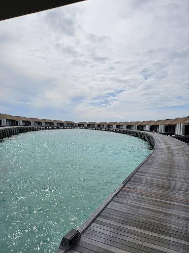 Another unique and beautiful aspect of this resort is the circular layout of the overwater villas. These days. many OWVs in the Maldives are arranged in straight lines, but at the resort, the villas are built in a graceful arc, surrounding a central lagoon. This design not only enhances the view from each villa but also creates a classic Maldivian postcard scene - perfect for iconic photos. Standing on the deck, you can take in a full panoramic view od the villas and lagoon.