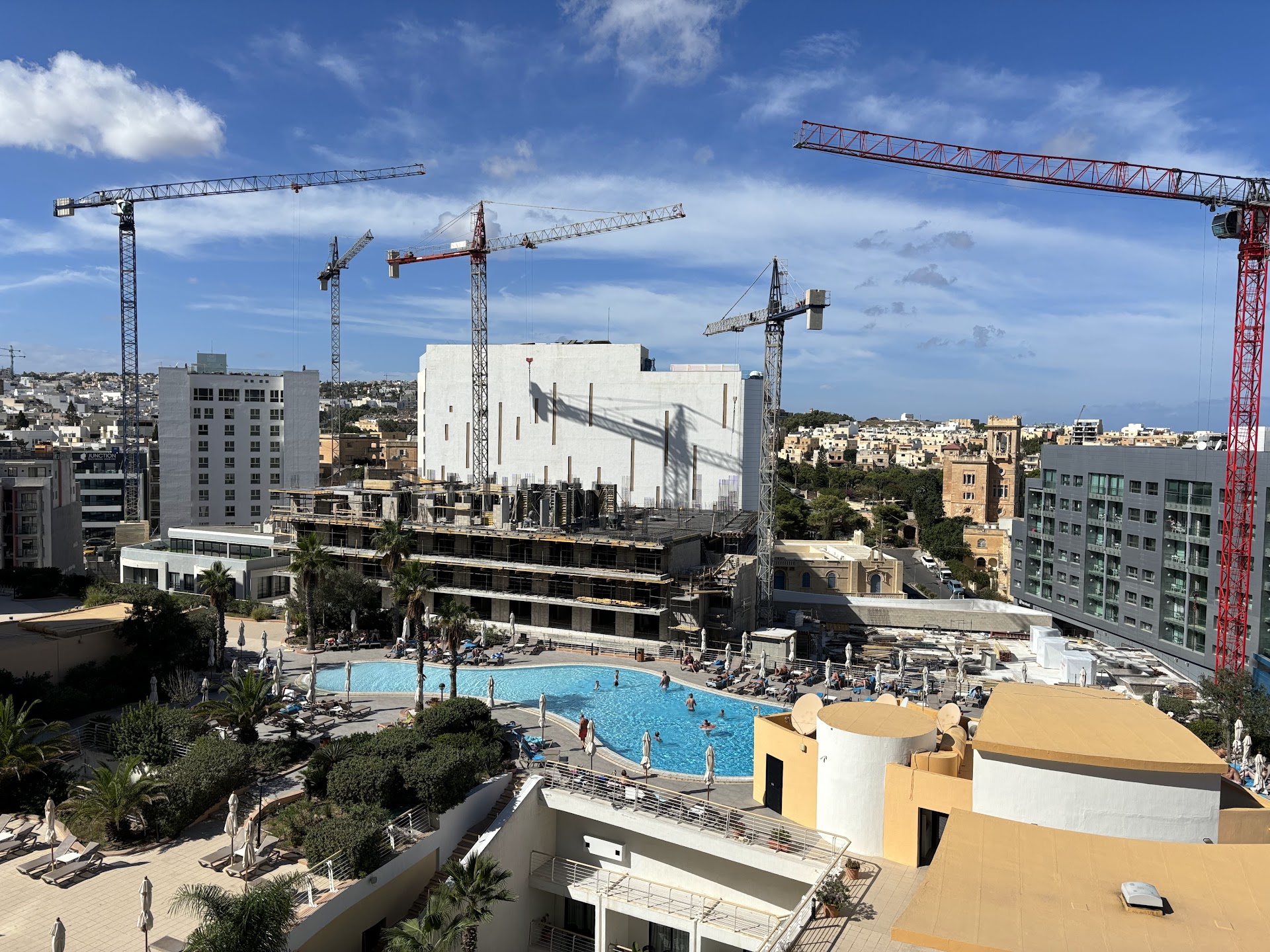The Hotel is in the middle of St. Georges Bay/ St. Julians.. an area densely packed with hotels and apartments, bars, restaurants and shops.. but its mid winter now so it completely alters what you can expect. It has a direct bus from the airport and good frequent connections to the city. there is also a taxi at the door of the hotel 24/7 but Malta has major traffic issues so be prepared for heavy traffice, slow journeys and high fares. I stayed here 6 years ago, when the new club lounge had opened and it was an excellent stay.. even though the hotel was undergoing renovation and the site next store was being transformed into an 8 storied Holiday inn Express.