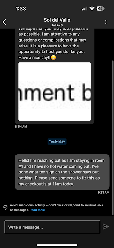 BEWARE, PLEASE READ CAREFULLY SO THAT THIS DOESN’T HAPPEN TO YOU. Check in was okay but the issue was that there was no running water and no one informed me upon arrival. It wasn’t until I got into my room and tried using the shower/bathroom that I realized nothing was coming out. We spoke with the person who was in charge of the check in and he said he didn’t know how long it would take to fix it. He called the owner of the property and we overheard when she said “give them buckets of water to use to flush the toilet”. Since I had an event at 4pm (checkin was at 3pm), I left the property. We came back around 1am and water was coming out but when we tried to shower and use the hot water, no hot water came out. We turned on the hot water the way the sign on the shower said and left it running for about 20mins but nothing. My husband even checked the water heater and it seemed like it wasn’t working. I waited till 9am to try again and see if hot water was working but nothing. I contacted the property via the Booking app to try and resolve the issue but no one got back to me on time as my checkout was at 11am.