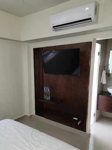 This hotel is relatively new, and the rooms are simple and modern. The single rooms are about 160 square feet and furnished with the essentials -- a firm bed, beside tables, small closet, AC unit, and a smart TV. Restrooms are also small but adequate. The hotel's location is great, very central. Amenities include a central dining area with a kitchen, public balconies and off street parking.