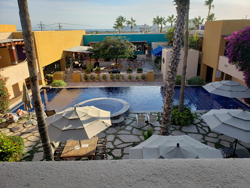 The is such a great boutique hotel. Clean, quiet. Breakfast is best! Friendly service. Room clean. Infinity pool is amazing. Landscaping super nice. Tips: bus comes every 20-30 minutes. You literally cannot cross that freeway. Driveway falling apart from rain and mudslide. Do NOT call a taxi from reception they will try to rip you off. 350-400 peso round trips for 800 pesos and call a misunderstanding when clearly trying to take advantage. Why Uber exists and preferred. Uber wasnt a 100 peso or $5 USD was usually $6.5-10 or 130-210 ride. There is a grocery store at Marina mall that we stocked up on sushi, don't get the pizza pretty gross, pastries for 10-20 pesos. Their is a food court in mall between pricer bars and restaurants, the 2 scoops of ice cream for 105 pesos but looks like gelato and the grande sized ice cold juices for 55 pesos at the place La B...something was such a treat!!! Los Patios has a swim pool towel system, cute courtyard, bar, restaurant i didnt see anyone enjoy but is there, luggage storage, a balcony that can see just 1 of those famous cabo rocks, freshly made eggs anyway you request them, water tastes clean nonchlorinated, and English speakers or use phone translations for those that need that. I would def stay here again and enjoyed not having to do huge resort walking and atmosphere for half our week here. The pool is 4.75 feet deep and warm. The hotel is weird spot, not walkable during our time because rain puddles cars splashing and in mostly non paved dirt road. If you are coming from the marina side of freeway you have to go quite a bit past hotel to take exit to turn around. Seems like your right there near Costco and Walmart but not sure...