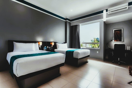 Read moreHabitación Doble Deluxe, tiene dos matrimoniales, un refrigerador, dos escritorios pero sólo una silla, plancha y burro, closet, TV y es igual a la foto. Tienen AGUA caliente y limpieza estándar. Si quieres desayunar ahí te llevarás una terrible decepción, su BUFFET desayuno es de todos los días huevo, no me apeteció probar a la carta, debido a que los costos eran muy elevados y la calidad de la comida era visiblemente mediocre. El SERVICIO es excelente, los empleados muy amables, la UBICACIÓN es lejana al centro pero servía para mis propósitos, las SALAS DE JUNTAS no es para huéspedes solo para empleados, el INTERNET es muy lento, el GIMNASIO está hecho para ejercicio ligero, mancuernas, bicicleta, escaladora y corredora. La PISCINA está tapada por la estructura del hotel y le da poco sol por lo que el clima frío no te dejara disfrutarla, durante nuestra estadía el hotel se llenó pero nadie nadó ahí, además es muy pequeña. Una gran escuadrón de policía estuvo estacionada toda la semana en el estacionamiento del hotel, no sé si es algún convenio pero esto hace SEGURO al hotel, lamentablemente lo mejor es no tratar con los policías ya que no son amistosos ni cordiales, al menos con los que tuve la desdicha de hablar. Por el precio pagado y lo recibido me ha dado una...