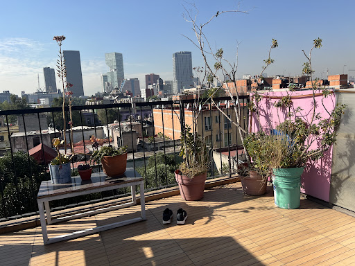 I was searching TripAdvisor for a place with a high rating, available the next three nights, but didn't find any. So I checked booking.com and found this place with a rating of around 8.9 (out of 10). I wanted a private room with private bath, and a "mini duplex" didn't cost a lot more (691 pesos vs. 541, both not including 19% tax), so I chose the duplex.||||What a find! It's a two-story room with windows on three walls. A stairway leads to the bed and private bath upstairs. It seems to have its own water heater. Outside is a courtyard where clothes dry; climb a flight of stairs above that to the nicely-finished roof where there are plenty of chairs and views over the city. There seem to be a few similar duplex/etc. units. My room was spotless and seemed as if it had been built recently.||||The location is great: a little more than three blocks from metro Guerrero, but on a narrow residential street that's quiet. Another metro station, Garibaldi, is about a ten-minute walk away, part of that along Paseo de la Reforma. A metrobus runs along the street that passes both of those stations.||||The common areas are very nice. The kitchen is large, and there's complimentary bottled water and coffee. They have laundry service: a washer and clotheslines. (If you want a clothes dryer, I'm sure there are lavanderias not too far away.)||||The booking.com website warns that there are stairs and that people with mobility problems should ask for the ground floor. The first stairway is wide and no problem if you're able to walk up stairs. But, above that stairway, the stairs are narrow and metal. If you're a heavy person, I think there's a chance that you'll feel uncomfortable on the last three narrow staircases, especially the spiral one. That's also might be a big gotcha if you have a large/heavy suitcase or bulky backpack. (My suitcase, which is the airlines' maximum allowed size, just fit the spiral staircase with not much room to spare. The friendly man who works here lifted it up sideways; I don't think there's any way I could have dragged it on its wheels. If you have a backpack, you may need to take it off to go up the spiral stairway. The staff can tell you better than I can, of course.)||||I hope TripAdvisor adds this listing! If they do, I'll try to remember to add a bunch of photos. This place is...