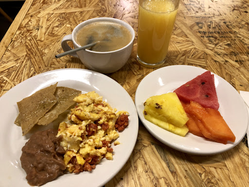 The breakfast is good for most omnivores except me. They offer chilaquiles (basic nachos), chorizo and eggs, beans, dry cereal (dairy milk and wheat products only), and a very small fruit plate with maybe 5 or 6 slices of fruit. Coffee/tea/juice as well. I don't drink dairy milk and can't have wheat or eggs, so I couldn't really take advantage of that. It would have been nice to have a mini fridge in the room for this reason as well.