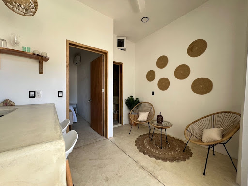Aunque relativamente lejos del centro, no lo es en auto y caminando puedes tardar 20 minutos, al centro, a la contaduría y al embarcadero El Conchal a La Tovara. Las instalaciones de primera y mantenidas. Las habitaciones tienen nombres y use la que se llama Aire, la cual esta subdividida, un área tiene el baño amplio, cocineta, mesa para 4 y una cama, en la otra área se tiene otra cama y el aire acondicionado, ambas tienen ventiladores y pantallas inteligentes para ver TV o YouTube. En áreas comunes se tiene un jardín con asador, una alberca y tumbonas. No tiene estacionamiento, pero el hotel tiene buena iluminación y CCTV en la calle, la cual tiene espacio para...