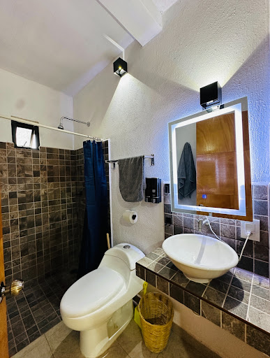 El baño está impecable: espejo con luz led, lavabo tipo bowl, buena presión y temperatura estable, regadera tipo walk in con loseta antiderrapante y todo muy limpio. De noche, la iluminación cálida y moderna crea un ambiente relajante.