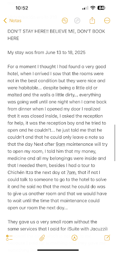 Read moreNO TE HOSPEDES AQUĂ!! CRĂEME NO RESERVES AQUĂ||||Mi estadĂa fue del 13 al 18 de Junio del 2025||||Por un momento pensĂ© que habĂa encontrado un muy buen hotel, al llegar vi que las habitaciones no estaban en las mejores condiciones pero eran lindas y estaban habitables⊠a pesar de ser un poco viejas o malteadas y las paredes algo sucias⊠todo marchaba bien hasta el una noche al volver de cenar al abrir mi puerta me di cuenta de que estaba cerrada por dentro, pedĂ ayuda a recepciĂłn, fue el muchacho de recepciĂłn y trato de abrir y no pudo⊠solo me dijo que no pudo y que solo podĂa dejar una nota para que al dĂa siguiente despuĂ©s de las 9am mantenimiento intentara abrir mi cuarto, yo le comentĂ© que mi dinero, medicamento y todas mi pertenencias estaban adentro y que las necesitaba, aparte tenĂa un tour a ChichĂ©n Itza al dĂa siguiente a las 7am, que si no podrĂa hablarle a alguien para que fuera al hotel a resolverlo y dijo que no que lo mĂĄximo que podrĂa hacer era darnos otra habitaciĂłn y que tendrĂamos que esperar hasta la hora que mantenimiento pudiera abrir nuestro cuarto al dĂa siguienteâŠ||Nos dieron una habitaciĂłn muy reducida sin los mismos servicios que yo paguĂ© (Suite con Jacuzzi) para pasar la noche lo cual no se me hace justo porque yo paguĂ© por algo y me dieron algo menor||Y al dĂa siguiente marquĂ© a las 8 para ver si por casualidad habĂan adelantado el servicio y habĂan abierto mi cuarto, ya que cualquier hotel hubiera hecho eso⊠y el muchacho de recepciĂłn muy molesto me dijo que NO! Que ya me habĂa dicho que serĂa despuĂ©s de las 9am que no podĂa hacer mĂĄsâŠ||PERDĂ EL DINERO (2400 pesos) QUE INVERTĂ EN MI TOUR PARA DOS PERSONAS ya que lo perdĂ al no tener acceso a mi cuarto y lo Ășnico que dijeron fue âDisculpaâ no nos ofrecieron ningĂșn reembolso para conversar las pĂ©rdidas monetarias que tuvimos por su ineptitud y su lento accionar, ni por la noche que no nos dieron los servicios por los que pagamos||||Al ir a nuestro cuarto ya abierto nos dimos cuenta que la chapa del cuarto no servĂa, ya que no leĂa la tarjeta y tampoco habĂa electricidad en el cuarto al ingresar la tarjeta⊠la chapa habĂa dejado de funcionar desde el dĂa anterior que el chico de recepciĂłn intentĂł varias veces a abrir el cuarto, yo pensĂ© que se habĂa blockeado⊠bajĂł nuevamente a recepciĂłn âactivan la tarjetaâ vuelvo y sigue sin servir, van y cambian las pilas desde la chapa y tampoco sirve⊠asĂ que tuve subir y bajar escaleras varias veces⊠al no tener luz no tenĂamos aire acondicionado asĂ que estĂĄbamos con ventanas y puerta abierta ya que la humedad era insoportable, despuĂ©s una corriente desde aire cerrĂł la puerta muy fuertemente y ahora si una trabajadora del hotel rĂĄpidamente fue a nuestro cuarto a decirnos que Ăbamos a pagar la chapa ya que por âaventarâ la puerta nosotros habĂamos descompuesto la chapa, cuando fue el viento⊠que querĂa? Que estuviĂ©ramos sudando y deshidratĂĄndonos en el calor? ||Me moleste y fui a recepciĂłn a comentarle al encargado de ese turno y solo me dice nuevamente que me pide una disculpaâŠ||||Al final mis perdidas fueron de dos dĂas de servicio mĂĄs el tour⊠y sin recibir compensaciĂłn algunaâŠ||||Y la cereza del pastel fue que el dĂa que me iba a retirar el hotel a las 4-5 am aproximadamente tocan mi puerta fuertemente⊠era mi vecina de cuarto (318) muy molesta⊠fue a prevenirme y avisarme que revisara mis pertenencias y mi dinero ya que le habĂan robado dinero de su caja de seguridad!!!!||||AsĂ que ten mucho cuidado y piensa antes de reservar||||Mi habitaciĂłn era la 319||||DON'T STAY HERE!! BELIEVE ME, DON'T BOOK HERE||||My stay was from June 13 to 18, 2025||||For a moment I thought I had found a very good hotel, when I arrived I saw that the rooms were not in the best condition but they were nice and were habitable... despite being a little old or malted and the walls a little dirty... everything was going well until one night when I came back from dinner when I opened my door I realized that it was closed inside, I asked the reception for help, it was the reception boy and he tried to open and he couldn't... he just told me that he couldn't and that he could only leave a note so that the day Next after 9am maintenance will try to open my room, I told him that my money, medicine and all my belongings were inside and that I needed them, besides I had a tour to ChichĂ©n Itza the next day at 7am, that if not I could talk to someone to go to the hotel to solve it and he said no that the most he could do was to give us another room and that we would have to wait until the time that maintenance could open our room the next day...||||They gave us a very small room without the same services that I paid for (Suite with Jacuzzi) to spend the night which is not fair to me because I paid for something and they gave me something less||||And the next day I dialed at 8 to see if by chance they had advanced the service and had opened my room, since any hotel would have done that... and the very upset reception boy told me NO! That he had already told me that it would be after 9am that I couldn't do more...||||I LOST THE MONEY (2400 pesos) THAT I INVESTED IN MY TOUR FOR TWO PEOPLE since I lost it when I didn't have access to my room and the only thing they said was "Sorry" they didn't offer us any refund to talk about the monetary losses we had for their ineptitude and their slow action, nor for the night they didn't give us the services for which we paid||||When we went to our already open room we realized that the sheet metal in the room was useless, since it did not read the card and there was no electricity in the room when entering the card... the plate had stopped working since the day before the reception guy tried several times to open the room, I thought it had been blocked... it went down again to reception "they 