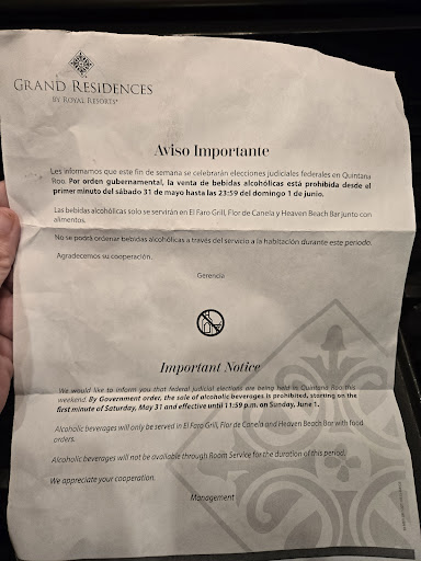 Read moreUpdate: The reply from Grand Residences is full of b.s. and deflection, including a MASSIVE LIE about the disruption to alcohol service around the pool during our stay. That reply is absolutely FALSE - the disruption was not a simple issue of time of day. It was literally a 100% full denial to serve alcohol around the pool on May 31st and June 1st due to elections in the area; guests were told 1 day prior. Photo attached.