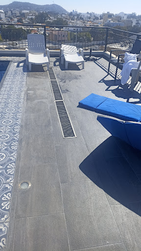 La alberca, leí un comentario que la alberca estaba "super caliente". Depende, si vas en invierno no esperes el agua a 40°. Si vas en los meses de más calor no esperes que esté a -2° 🙄🙄🙄 un poco de sentido común... La alberca está en el techo, al aire libre, el sol, la lluvia y las inclemencias del clima le pegan directamente así que la temperatura de la alberca debería variar todo el año. No me tocaron los camastros rotos, de plastico que estaban en la imagen de la compañera de unos comentarios de abajo. Me tocaron unos bastante normales, decentes diría yo, muy aceptables, una de las tardes ahí me quedé profundamente dormido. No hay sombrilla, solo el vestigio de lo que alguna vez fue, y hay 2 sillas, 2 camastros, no más. Hago un paréntesis, si la chava de la recepción, recuerden que se va a las 5 de la tarde, de ahí en adelante ya valió, no hay nadie ahí, solo dejan un teléfono de emergencias que no tuve la mala suerte de usar. La atención mientras estuvimos ahí fue maravillosa, ambas chavas de cada turno se portaron excelente, la dueña muy amable. Todo...