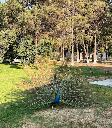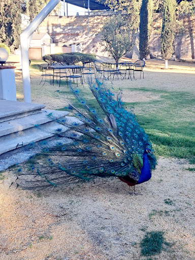 El ambiente templado fresco natural de la zona, grandes espacios para caminar, aplausos porque dejan libres a los pavoreales y la gente tmb que es respetuosa con ellos, tienen fogatero para quema de bombones ($680) y amplio estacionamiento, la alberca en la mañana es agua fría, medio entibia hasta la tarde, es tipo chapoteadero muy pequeña y con jacuzzi, creo que es aceptable para el clima, aunque seguramente en temporada invernal debe estar fría.