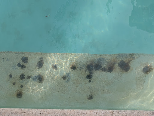 outdoor furniture piled haphazardly on the bench and out dated deck chairs around the pool