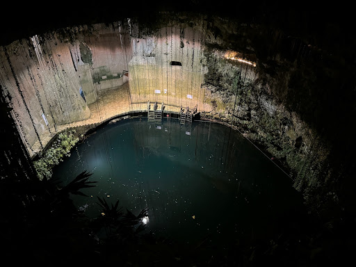 We arrived early, but America in the office got the staff to ready our room. We received armbands, that got us breakfast each morning and entry into the Cenote. We were told the best time to go to the cenote (right on the hotel property) was in the morning before or later after the tourist buses stop from Chitzen Itza. She also told us the cenote was open until 8pm. ||||The "bungalow" had a king bed, and a sofa bed, chairs, a small fridge. The bathroom had a jacuzzi tub and shower. Lots of soft towels and toiletries. We had a pretty large choice of breakfasts, including juice or fruit, bread, tortillas and eggs. It was great. We also had dinner there one night that offered a buffet with lots of choice.||||To get to the cenote, you climb down 90 steps. There are chain railings to hold on to, as sometimes the stone stairs are slippery when wet. There are lifeguards, and life vests available. The water is cold!!! Most didn't seem to mind, but I was delighted my sweetie had packed my 5 ml wetsuit. We also brought our snorkels and masks and delighted we did. The light shines down into the cenote, and with our face masks we could see what looked like a disco ball of light shafts bouncing up to us. There were a few freshwater fish. We decided to return around 7:15 pm. The cenote was closed. But we walked to the park entrance and found a security guard. He opened the entrance to the stairway, turned on the lights and down we went. We were all alone in the cenote. It was magical...