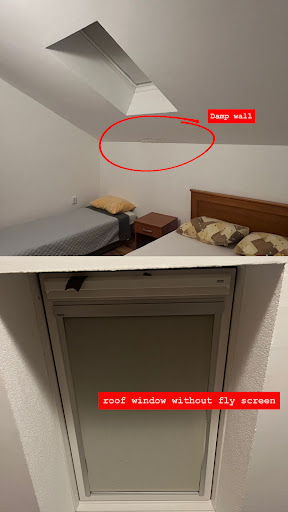 The room I booked and couldn’t even check into does not have air quality or oxygen levels suitable for a human being! If you try to ventilate, there are no mosquito screens on the door or the sloped roof window — so you’d have to share your room with every kind of insect imaginable! Also, the photos are very misleading! There isn’t a single private apartment on the top floor of the property — the terrace is shared! Moreover, the room assigned to me is sandwiched between two corner units and doesn’t even have a proper window! The bedroom has damp, moldy walls damaged by water!