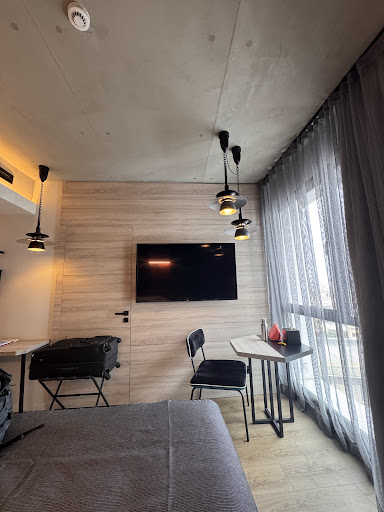 The room we received was modern and stylishly decorated, complete with air conditioning. It included a comfortable bed, a clean bathroom, a mini-fridge, a coffee maker, and an electric kettle. I must particularly mention the housekeeping by Josephine, who ensured that we lacked nothing in our room. The hotel is also an excellent choice for long-term stays, as it offers smaller apartments with kitchens and a publicly accessible laundry room equipped with both a washer and a dryer.