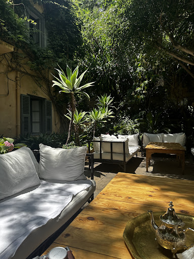 Despite its hectic location near the harbour—with its dusty street life and the pungent smells drifting over from the nearby fish market—Mimi Calpe Tanger is, at first glance, an oasis of calm and lush greenery amongst the chaos. The gardens that climb the hill are charmingly arranged: shady terraces with sofas, a lovely pool area, and even a treehouse room perched at the top. On arrival, we were welcomed warmly by the friendly young staff, offered coffee while waiting for our room, and given a pleasant tour explaining the history of the place.