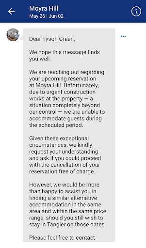 We confirmed and booked Moyra Hill, Tangier 6 months in advance, only to be told 4 weeks before arrival that our reservation was cancelled due to “construction work.” By that point, we had already booked and paid for our flights.
