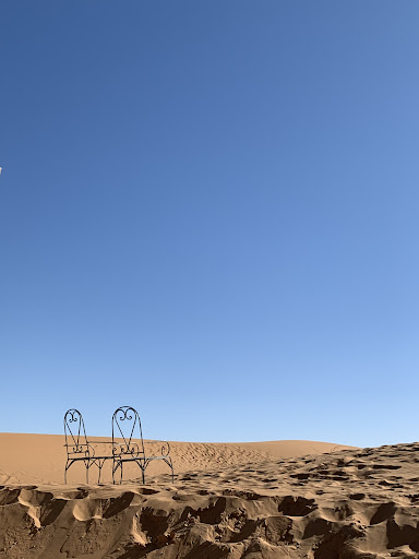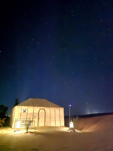 I came here whilst I was on a 3-man motorcycle trip a cross Morocco, last November (2024). I had never been anywhere like this before, it was really amazing. I had never ridden a motorbike on sand before, I found it was a bit challenging to reach the camp from the main road because I am not experienced, but once I got there our hosts were ready to receive us and help us get settled in and stay cool. They were generous and helpful at all times, and I enjoyed talking to them. We had an amazing time going for a ride on their quad bikes across the dunes (it was really one of the most fun things I've ever done) and our guide taught us about the people that live in the area. It's an incredible place to sit and enjoy the view, during the day or at night. At night you can see distant lights crossing up and down the dunes, vehicles and camper vans making their way across the sand. Our hosts made us some very delicious food, then we sat round the camp fire and they played us music and sang songs to us. We all had a good discussion about football, watched Madrid vs Barcelona on my friends phone. I loved talking to the people who worked there, they made our stay very special. I recommend staying...