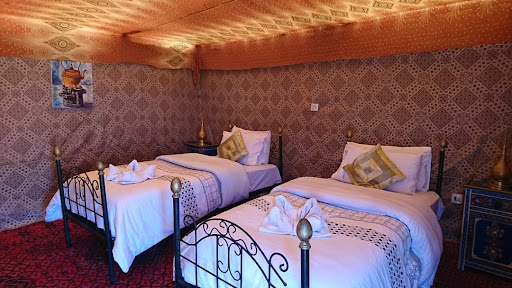 Read moreMy husband and I stayed here as part of a Berber Treasures Morocco tour and just loved this camp. We felt treated like honoured guests. We were taken from the kasbah we stayed in on the edge of the Sahara dunes to the camp and stepped out onto red carpet. Our tent was spacious with carpets on the sand floor, equipped with a four-poster bed (apparently we had the most luxurious tent) and a low table with pouffees and an en-suite with toilet, basin and shower. Water pressure is low but when you want a shower, just ask for the pressure to be increased.||We had a camel ride to part way up a dune then scrambled up the top ostensibly to see the sunset but sadly the weather didn’t cooperate. A lovely ride though and amazing views. Getting on the camel was ok but the camel rising and sitting down is a bit alarming as it lurches back and then forwards, or is it v.v., but staff helped stabilise us.||We had pre-dinner nibbles at a little table on a small rise then had a beautiful four course dinner. Really delicious. One of the courses was eggplant (aubergine) tagine with tomato and cheese. My husband is not keen on eggplant but he really enjoyed this. Breakfast was at the same table.||We are so thankful we decided to do a tour that included going to the Sahara. You get a totally different experience of Morocco than if you just do the usual tourist trail of Chefchaouen, Fez, Marrakech and Casablanca. In addition even just the drive from Fez to Merzouga (the nearest village) is really interesting and the drive from Merzouga to Marrakech via Quarzazate over the High Atlas is...