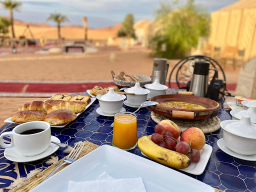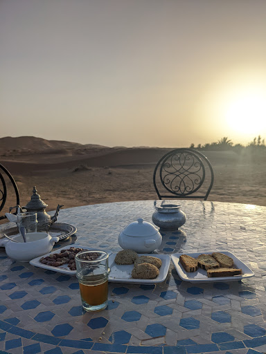 where do we begin! Orient Desert Camp was referred to me by a friend and we can't be happier with our Sahara Desert experience. i actually booked directly with Said via email and he was happy to set up 2 nights for us at his camp! we could not believe how warm and welcoming the family and staff they were right off the start. we had arrived late from Marrakech on the Supratour bus and Said waited to greet us and take us back to the camp. upon arrival we put our bags in our rooms and was immediately fed the mostly delicious dinner - we are still so grateful for how well we were fed. lthe chief here is so wonderful and his food is absolutely DELICIOUS, by far the best meals we've had in Morocco. really - eveything he makes is so flavourful, he was able to make veggies so tasty!