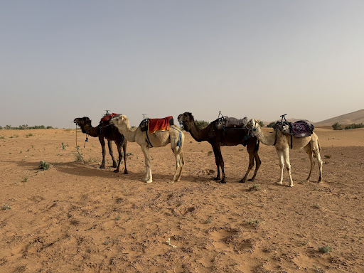 Read moreThe camp experience starts at an abandoned hotel. You get picked up and taken to the camels. Camel ride to the camp is approximately 30 Minutes. You do not go far into the dunes, only a few hundred meters in unfortunately. The rooms appeared clean and fine, no fan or AC! Unfortunately tent #7 had a bent door that could not shut, instead it banged open and close all night in the wind, we didn’t sleep a minute all night from the noise. Food was ok for dinner and breakfast. Bring your own wine or beer if you want to drink! Music was ok, it was 2 songs around the fire and then most of the team disappeared and Mustapha stayed behind to sing songs with the guests. It was near impossible to find any staff during our staff, the main guy at the camp seems not happy to be there, he was just very obviously not motivated. No bottled water in the room either, shower and toilet was fine, but couldn’t use it since the front door was banging open non stop with no way of pulling it closed. It opened while I was in the toilet so I decided against a shower. Trip back in the AM was by pickup truck. Guys in the bed, women inside. It was super windy and hammered the guts with sand out back. The drivers were super nice on both the trip in and out. Actually by far the nicest people during our stay along with our camel guide. No big camps close by...
