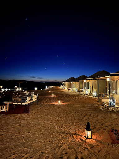 The camp itself is located on a small hill, so there is a very beautiful view of the dunes. The territory is also very well maintained, in the evening with the lighting everything looks incredibly cozy and colorful.