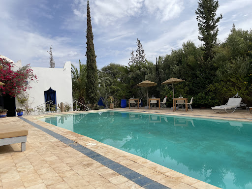 Read moreNotre choix s' est fixé sur l'Ecrin de Mogador proche d'Essaouira. Cet endroit porte bien son nom ; dès la grande porte bleue ouverte on est dans un autre monde ! Jardin verdoyant et fleuri, l'architecture typique des bâtiments blancs et bleus se reflétant dans la piscine ! Un véritable enchantement après les paysages rugueux et secs traversés depuis l'aéroport. Nous y sommes chaleureusement accueillies par Pascale et Patrice, couple très à l'écoute de leur clientèle ; ils savent conseiller pour toutes les visites possibles, les bonnes adresses dans les souks, les activités sportives : sports nautiques, cheval, quad (magnifique expérience sur une plage déserte et sans fin !), hammam pas pour touristes, le local ! A faire. En excellente cuisinière, Pascale nous a régalées de sa délicieuse cuisine marocaine (tajines divers, couscous, gåteaux, fruits),, tous ces mets parfumés d'odorantes épices. Que dire également des copieux petits déjeuners : confitures maison, petits pains, galettes,! ! Il fallait bien ça pour attaquer une journée chargée. Les chambres accueillantes et salles de douche toutes personnalisées donnent sur une terrasse meublée de petites tables et fauteuils sur des tapis bleus ! Tout ceci face à la piscine. Pour vos déplacements , prévenez Pascale ou Patrice pour réserver un taxi (un peu folklo) mais pratique et pas cher. Nous sommes toutes les 8 (nous occupions toutes les chambres !) revenues ravies de ces 5 jours bien intenses. J'espère qu'en lisant ces lignes de nombreux lecteurs auront envie de séjourner dans ce cadre idyllique, et qu'ils profiteront de la sympathie et du dynamisme de...