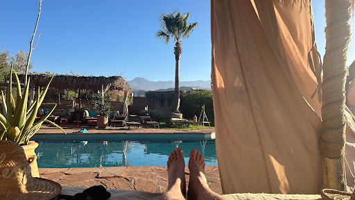 The swimming pool and surrounding terrace are perfect for relaxation and watching the sunset. We also managed a good 9km hike towards the Atlas Mountains, encountering many sheep, goats, turtles, and very friendly locals.