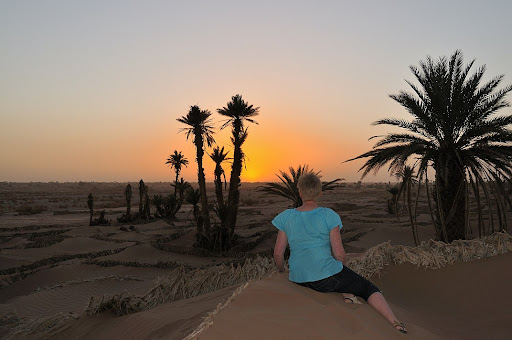 If "off the beaten track" is for you, head for Le Drom'Blanc. I can't recommend it highly enough. I slept in one of the bungalows, a simple palm-thatch hut, plain, but perfectly comfortable; no 'en suite' - but if you've come to the desert you won't expect that, and the shower/toilet block only a few steps away is more than adequate. But far the best aspect of this lovely little place is the welcome you'll get and the way that you're taken care of in every way. Maguy is a brilliant hostess, ably supported by the wonderful Omar - who is perfectly at home in a huge variety of roles from cook to waiter (which he does with more aplomb and elegance than I've seen in some 5star joints) to entertaining walking companion. From the moment of arrival, you're made to feel welcome, with real warmth and sincerity. Nothing's too much trouble, excursions are arranged flawlessly, advice given freely. The unexpected arrives - you might find yourself visiting a Berber family, or exploring the deepest reaches of a ruined kasbah with a local teenager as your guide, or taking a surprise mule ride into the desert... Breakfast is delicious - Berber bread and crepes, made by Omar's mum, with an assortment of date, fig, apricot and quince confitures, juice, tea and coffee. All served in the morning sunshine. (which in February, with Europe shivering in sub-zero, is hard to beat!). Dinner is just great, a convivial affair, all eating together with excellent home cooking - typically pumpkin soup, tagine and a dessert, accompanied of course by "Berber whiskey" - tea, served with a flourish by Omar. Worth noting that eating in is pretty much your only choice - this is the desert, so not noted for a variety of eateries just up the road... But none the worse for that. There's so much to do here - or nothing at all, if that suits you. There are desert excursions by dromedary or 4x4; Omar is happy to accompany you to Vieux M'Hamid, show you the best people to buy carpets from, drink tea with etc (on which note, bring plenty of cash with you - the nearest ATM is over an hour's drive at Zagora. You'll be tempted to buy something, I'm sure. And it's better to settle your bill at Drom'Blanc in cash also.) Whilst I was there - a five-night stay - there were several regular clients who returned time and again to this magic place. Which speaks volumes for just how good it is. I'll be...