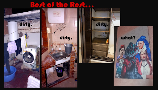 The bathrooms are bog-like: They moulder, they fester and reek. Toilet paper is still on WW2 rationing it would seem. The shower head: snapped off. The door handle: snapped off - My family had to be continuously ‘rescued’ from toilet trips.