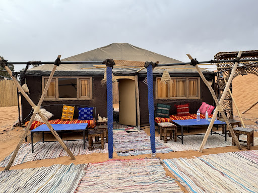 Read moreArriving on the overnight bus at 5am, Zayad picked us up and escorted us to a clean and simple private room - perfect for weary travelers. After sleeping for a few hours and showering, we were greeted with breakfast and an explanation of Sahara camel trek. ||The trek consisted of a one hour camel ride through the desert in order to view the sunset over the dunes. Then we were taken to the desert camp which looked simple from afar but was actually lavish, beautifully decorated, and exceptionally comfortable. Each couple/family was given an individual metal frame tent with comfortable beds (two twins, one queen per tent with a curtain to separate the beds) - the room was decorated with tapestries on the walls and rugs covering the sand. The rooms even had electricity for a light.||Additionally, there was a tent for eating that was beautifully decorated and even had art on the walls. There was a bathroom at the camping site with running water and flushing toilets.||The desert guides cooked us a wonderful meal of rice, chicken tajine, bread, and fruit. The meal was more then plentiful and very delicious. After dinner, the guides played traditional Western African drums and sang too. It was a really fun evening of singing and learning to play their drums. ||The next morning we awoke to see the sunrise and trekked the hour before to the hotel on camels were a lavish breakfast spread was...