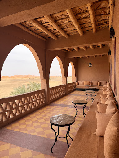 The hotel itself: The location and views are absolutely stunning! Our shuttle from the airport was organized seamlessly. Keep in mind that this is a 3-star hotel in the middle of the desert—so of course, little things like spotting a cockroach can happen. This isn’t about the hotel but simply part of being in the desert with open windows. Our AC worked perfectly, the rooms were nicely decorated in an authentic Moroccan style, and the beds were clean with fresh sheets changed daily. For us, it was the ideal middle ground: not a tent, but also not a modern 5-star resort. Everything—from AC to WiFi to running water—worked without issue. The pool area was another highlight: beautifully set up, with perfectly cold, refreshing water after the heat of the day.