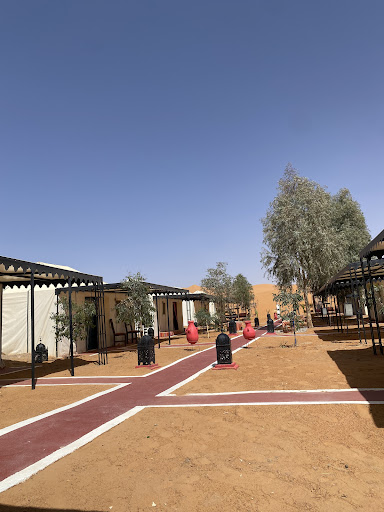 Nice place to visit. You can park your car at secure parking at Hotel du Berger in Merzouga, and the team collect you in their 4x4 to take you to the campsite. You are welcomed with mint tea and shown to your tent. The tent is simple with comfy beds, a thick duvet and lots of blankets which was ideal because it can get cold at night. There is a small toilet room and a small shower room - both are ok. Hot water is available at set hours in the day. There are NO electrical sockets in the tents, only in the restaurant at the top of the camp. If you want to charge your phone, you will need to do it at the restaurant or bring a portable battery/charging block. The wifi at this camp is not great either.