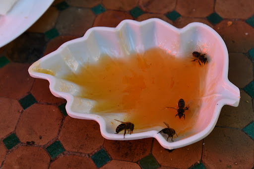 Be aware of bees and cats when you eat breakfast at an outdoor terrace. Better eat up breads before bees start their job on marmalade.