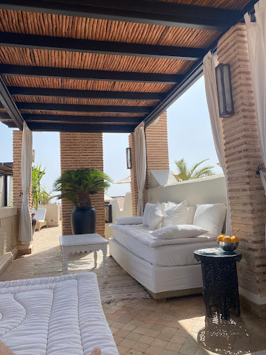After checking in, Jana gave us a tour of the riad, explaining all the amenities and what was included in our stay. This was our first experience staying at a riad, but it felt like stepping into the fairy tale of "One Thousand and One Nights." The inner courtyards were immaculately maintained and decorated in the finest detail. Everywhere you turned, there were sitting rooms filled with fresh, ready-to-eat fruitâthe flavor of which was so rich and delicious, something we seldom find in Europe. The rooftop terrace was filled with cozy beds, cushions, and curtains, providing a perfect place to relax.
