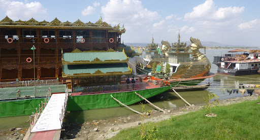 What a hotel! I've never stayed anywhere like it: 2 ornate chicken heads adorn the twin bows closely backed up by huge white elephants. Surreal enough for you?||You'll have plenty of tourists taking photos of it from the river!||Our ‘suite’ wasnt actually a suite as it was 1 room but it was pretty big. Teak walls and floor with fantastic views over the river. ||V friendly and helpful staff if a little short on the English speaking dept. ||The restaurant is good with a large selection of dishes and cocktails. I don't like eating in hotels, I prefer to go out but we actually ate in quite a lot Plus a litre bottle of absolute vodka is £11! ||The big question: would I stay here again? Yes: the location is good even though it's out of the centre as it's handy for the tours. However it does come with some provisos: ||I'd like to add here that I don't want to sound too dismissive of this hotel, I really did like it, but its worth people noting some of its "peculiarities":||its noisy on the morning from the boats on the river which start around 4.30am but really get going by 6.30am. It's noisy from the restaurant on the top floor. It's noisy from weird mechanical noises from God knows what (possibly setting up for a locals wedding the next day). It was incredibly noisy on our last night when a party of rats escaping the monsoon rains had a party in the space above our ceiling. Never heard anything like it, felt like I was part of the party. ||Being in the water there are plenty of mozzies, especially in the restaurant when someone leaves the doors open all day. We had 2 huge cockroaches on the bathroom one morning (I learnt that they can fly back onto the boat when you try to fling them into the river). ||The tap water is a semi dirty brown colour, the colour you expect it to be AFTER having a bath from a long hot sweaty and dusty day of sightseeing. ||Breakfast could do with some improvement as the American option is toast, a few tiny stands of bacon, bland omelette, chicken sausages and luncheon meat. Asian option is a very basic fried rice. Evening meals are good with decent portions, altho did have to explain that yes the steak we wanted SHOULD contain meat and fries IS NOT fried rice. Comedy. ||WiFi is patchy sometimes nothing sometimes only Facebook or WhatsApp will work but not Google search. The staff were very nice and lent us a WiFi dongle for a couple of days which worked great. ||2 large seats on the balcony outside the room with cooling fan that takes some of the heat and humidity away. Quite delightful local music drifts across the river from the small villages on the opposite bank. If heading to bagan by boat the MGRG ferry is literally next door so takes some if the pain off the 7am departure.||But I still give it 4 stars for the purely unique...
