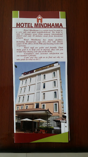 Read moreWhen I first came to Yangon in 2012, most mid-range hotels were old and tired. What a difference 2 years can make. As I needed to stay close the Myanmar Convention Centre, I discovered the Hotel Mindhama and what a little gem of a hotel this is. ||||First of all it's new. The staff are so nice and eager to please. They genuinely want you to enjoy your stay with them. Although the breakfast is basic, it's adequate and the small dining room is cosy. ||||The Hotel Mindhama is close to the airport and Myanmar Convention Centre, and about 9kms from the downtown area. For some this may be a little inconvenient, however it is easy to catch a taxi and there are numerous buses. The hotel has room service, although I did discover some restaurants about 1km away which looked quite OK (I did not eat there). ||||The hotel is also very close to Inya Lake, a very popular spot for locals. I would highly...