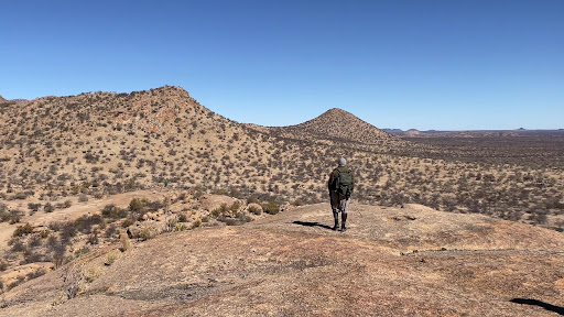 This is a wonderful place: remote, peaceful and with the most wonderful staff.||Set on elevated terrain about a 45 minute drive off the main road, the Al-Aiba Lodge's elevation gives commanding views over the plains below. We were booked in for just one night through our UK booking agency, and on arrival were welcomed with drinks and chilled flannels. The wonderfully friendly Hilma gave an excellent welcome briefing, and soon we were able to drive from the central lodge to our accommodation.||The central lodge is a striking building constructed in traditional style, open plan but with a wonderfully serene ambience. It houses the reception, a smalll shop (with some very appealing and high quality products), the lounge and dining area. It opens out to the outdoor area, with lawns, a reasonably sized pool and fire pit. It's just so relaxing, especially with such commanding views to the far mountains, with a waterhole in the foreground.||The site has a one way track, which we took to our lodge. The lodge was semi-detached, with sufficient parking for two vehicles adjacent to the track. Our accommodation was perfect: well appointed and comfortable. Note that water is a precious commodity here, but it's amazing how little water is required for a shower.||Our arrival brief included details of the lodge's activities. It advertises itself as a centre for mountain biking, and indeed the trails looked good. Also a sunset walk (may be defined as a hike in American parlance, bit far too short under the UK definition to qualify), and information on the rock painting trail. The latter appealed, so with our trail running shoes, we did a few circuits of the short trail, taking in the magnificent rock paintings. The trail is well marked, and the initial steep ascent offers superb views.||We enjoyed an excellent dinner on our one evening. Superb food, nicely presented. An early departure meant we were unable to stay for breakfast. But we enjoyed the afternoon tea and cake!||it's possible to see wildlife from the lodge, either from the outdoor sitting area by the main lodge, or the patio from one's own accommodation. We saw giraffe, Oryx, Springbok and cheeky warthogs 'mowing' the lawns! Out running, inquisitive primates spied on us, and as the evening drew in, rock dwelling hyrax (like over-sized guinea pigs) came out.||I briefly mentioned the staff. Professional, efficient and very friendly. I've already mentioned Hilma who welcomed us. But also, the manager was excellent. We thought we might have had a tyre pressure issue. But armed with his tyre pressure gauge, we established that we didn't. And he arranged for us to have a pre-prepared 'grab and go' breakfast to accompany us on our very early morning departure.||We loved our brief stay here, we wished it could have been longer. But we recommend it...