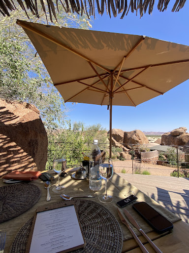 There is so much to like about this camp , but unfortunately the dislikes over weighed things for us.|So lets start with the good. The drive to the camp is spectacular , Damaraland was one of the most beautiful areas that we travelled through in Namibia. Be advised though there are a lot of beggars on the roadside who the moment they hear a car will run out to try to sell you goods . The lodge is carefully designed around the rocks in a koppe, and is difficult to spot until you arrive. It is set on three levels, on the ground all of the chalets are carefully built so you are secluded from other guests and all with a small terrace with great view. On the next level is a lovely open sided restaurant / bar with spectacular views and a small pool and on the top a viewing deck where you can have sundowners . Your chalet is one very big room with a huge bed , small seating area and table and fridge . The bathroom and toilet are all outside which is lit at night . Outside is also a terrace area where you can sit and watch the view , although we saw little wildlife there apart from lizards. The restaurant probably had the best choice of food of anywhere we stayed , with a three course meal every evening and very high dining . Breakfast was an amazing lovely platter of fresh fruit, yoghurts bread and baked goods served to your table and a range of cooked to order hot food. They also offer a range of activities , although we had booked ours privately.|All good so far, now to the negatives. The chalet was the only accommodation on our 3 week trip that did not have mosquito nets, yet it was the only place that needed them. Despite spraying the room with the Doom spray they provide, both before and after dinner and covering ourselves in insect repellent we were bitten to death every night ( I had 15 bites just on one leg, and even a month later I still have marks left on legs)|The outside bathroom is lovely, but ours was situated directly under the restaurant and you very wary of how any " noise" may travel. If you need the toilet at night although it is lit, it does mean it attracts all sorts of bugs and insects that you have to battle through. Also I was taken ill on our last night and needed to make urgent trips to the toilet, and the distance to the toilet was troublesome. However our biggest issue was with the staff, right from the start of our stay. When we arrived , we were met in the car park with someone with wet warm towels, lovely after a long hot drive. There were also two other staff members who instantly we arrived , were demanding they needed to take our bags to reception , really hassling us whilst we were trying to sort ourselves out. They took off with our bags whilst we were left at reception , where another member of staff demanded to see our travel voucher ( the only accommodation on our whole trip that did) and then sat scrutinizing it and looking at his list for several minutes like it was a forgery. Eventually he stopped and then started telling us about all the activities which took ages ,before eventually asking which ones would we like to book. Even when we said could we think about it as we were tired and just wanted a shower, he kept insisting he needed to book them for tomorrow until we finally stated we would let them know at dinner . We were then taken to our rooms , and the guys with our luggage showed us around and then just kept standing staring at us until we gave them a tip. Again at dinner we kept being hassled about booking trips , until we said we were driving ourselves . The waiters were very efficient , but seemed almost scared to chat to guests apart from the script about the food or camp. At the other lodges staff were very friendly and chatty , and loved to talk about their lives and tribes but not here. When we went to move our table slightly due to some rain starting, our waiter rushed over and said don't do that I would get the sack if you were seen doing that. On our final morning we were leaving early and had checked if it was ok for us to have an early breakfast at 6.30am when their guests leaving for an activity were having theirs, which was agreed. However when we got there there was a lot of fuss by the staff as they had not been informed to set a table set for us. We said that was fine as all we wanted was coffee and toast, we specifically said don't bring out the platter and everything else as we were heading off early. The waiter kept fussing backwards and forwards bringing various cutlery , glasses etc and several times we said we don't need that just coffee and toast is fine. Eventually that turned up and then a few minutes later he turned up with the platter and all the rest of the breakfast items. It was also odd that all the staff were men, they seemed to be no woman on the camp at all , which was very different to all the other lodges we had stayed. It felt that the staff were so over trained , and working to a very rigid script and regime that you and they could not relax, and with the hassling to get you to sign up up to activities we did not really enjoy our stay here . Its the only place on our trip we would...