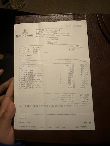 We went to this place because we’ve been here before however this time we felt like we’ve been ripped off. First of all they don’t even have the menu order. We asked for Gurkha and guns but the waiter named Arjun said they are out of it. Then we asked for Black label 750mL as mentioned in their menu the price is marked at 13000. Then the waiter said they will give us 1 liter black label. Mind you, we asked for 750mL and he kept saying 1Liter since they are out of 750mL, he then proceeded to recommend us that he would give us 750mL out of the 1 liter as they are not able to pour the 1 liter in 750mL bottle. To which we agreed to, because firstly our choice was G&G since they were out of it we asked for 750mL. The waiter did not once mentioned anything about any price difference and when the bill came they charged us almost 4000 extra on the black label. You can check the receipt they charged us 30mL, quantity 25 which actually totals to 750mL however decided to charge us per pack. We’ve requested the bottle 750mL but the waiter Arjun himself said he will pour the 1liter into 750mL portion and mentioned nothing about charging us per pack but when he brought the receipt and when we questioned why he charged us the way he did, he said he mentioned us about charging us per pack. We were 5 people and not one person heard him say anything about charging us per pack. If he had told us about charging us per pack and told us about the price difference from the beginning, we would have paid, the situation would have been different however not being told about the exact price left us feeling cheated. He was rushing at the end, kept closing the menu and the receipt to avoid me from taking pictures. It’s just unacceptable. The menu price is way way overpriced and despite being ok to pay menu price we later got cheated to pay more. We could have brought 3 bottles for the price we paid and this is...