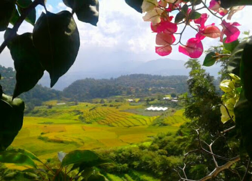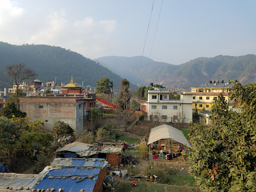 Sitting on a steep hillside just below Pharping, this place is a mixture of hotel and family stay. Our room was in the newer building with a large balcony facing towards Kathmandu and spectacular view. The room was clean, very spacious, with a double bed, small kitchenette (gas stove with kettle, sink, fridge) and a wood oven for heating and ceiling fan but no AC (we needed neither). Windows had moskito nets.