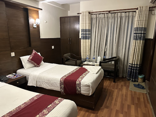 While we had requested two rooms with couple beds, we were given twin beds, which was a bit disappointing. However, this did not detract from the overall quality of our stay. The hotel is located in the Thamel area, which is a bustling neighborhood full of shops, restaurants, and bars. While the hotel does not have a lift, this is common in the area, and the staff was always on hand to help us with our bags.
