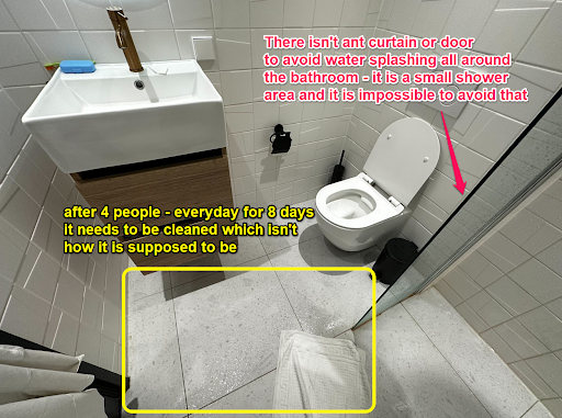 The reasons are They say that the room is for 4 people but we figured out that barely 2 people can stay in this place. Here are the reasons: • We arrived at the place and we found out it is a very small place and 4 people can’t spend 8 days here – 2 people can’t either. As the 2nd floor doesn’t get enough air and AC can’t help to cool the 2nd floor and provide fresh air, it makes the 2nd floor unreasonable to sleep on. • After we arrived at the place, the 1st floor was cold enough and the 2nd floor was boiling (beginning of September). We set the AC to a low temperature and left the place. • Once we arrived at the place, the 1st floor was quite cold and OK but the 2nd floor was still boiling. The windows couldn't be opened, and we couldn’t find a way to get fresh air. • We tried to sleep the first night, I was sleeping on the 2nd floor and woke up several times due to lack of air and it was very hot. Meanwhile, people who were sleeping on the 1st floor were freezing. • Going up or down the staircase is difficult and for the same reason we couldn’t take the luggages up. You can see it from the pictures. I went down to the bathroom and the bathroom door was also quite difficult to close and made a loud noise and woke up people while entering and exiting. You can see it in the videos. • The living room space is not enough to spend some time for 4 people. There wasn’t any space for the luggages, if we kept the luggages in the living room, we simply couldn't fit in the room. And considering that we booked this place to spend for 8 days, this is a nerve-consuming setup. • The bathroom shower area wasn’t protected by a door or curtain, so after each shower the whole bathroom gets wet and there isn’t any equipment to clean this mess. Again, consider that 4 people will stay here for 8 days, this is unreasonable. There was nothing to remove the water with. A small squeegee would have done the job. • The boiler does not allow for 4 people to take shower one...