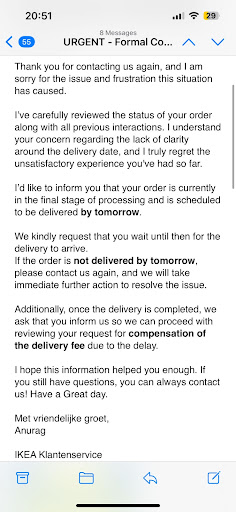 I hope this message reaches someone who can understand the depth of frustration and disappointment I feel regarding my recent experience with your company. Five weeks ago, I placed an order for a couch, expecting the seamless service Ikea is known for. Unfortunately, what followed was a string of incompetence and disregard for customer satisfaction that has left me seething.