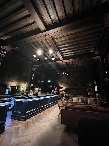 Reception/lounge: It's in a gorgeous 19th century room with high ceilings, murals on linen 'wallpaper' and carved wooden beamwork. The non-alcohol bar stays open all night (residents only) with comfy sofa seating and tables with power point access. There's no kitchen so you can't cook or make your own tea/coffee but a basic espresso costs only Euro1.80 and if you ask they'll give you a mug of boiling water to make your own tea or instant. Pizza (10 euros) is also available 24 hours, handy for late night munchies.
